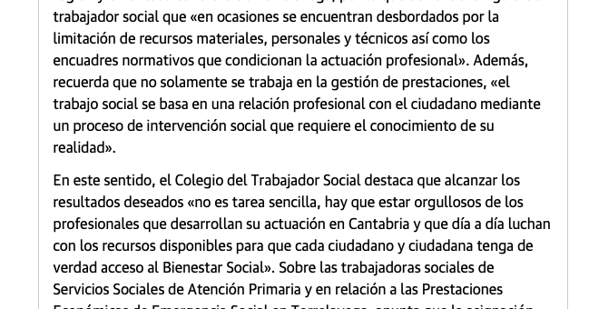 Dado las opiniones pronunciadas en diversos medios y foros sobre la actividad profesional desarrollada por los y las trabajadoras sociales de Servicios Sociales de Atención Primaria en relación a las Prestaciones Económicas de Emergencia Social en el municipio de Torrelavega, se considera necesario precisar algunas cuestiones en prensa.